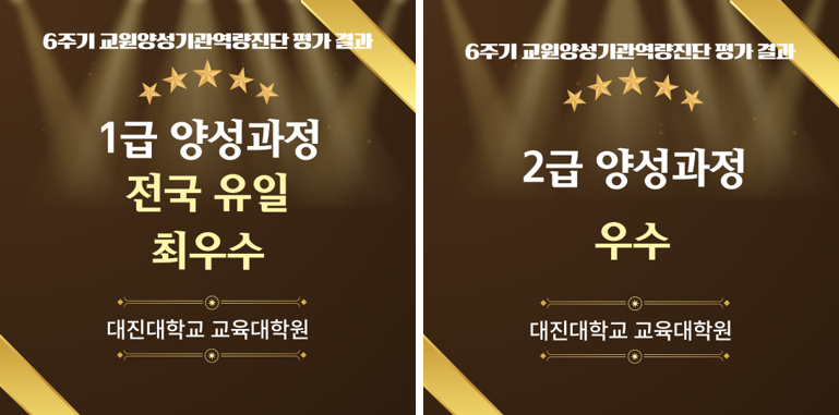 우리 대학원이 금번 '6주기 교원양성기관 역량진단 평가'에서 다음과 같은 결과를 거두었음을 안내해 드립니다.